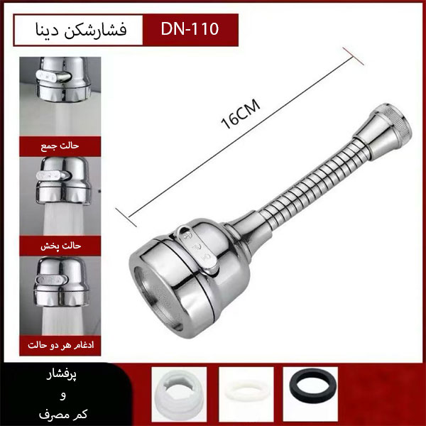 سری شیر ظرفشویی دینا مدل DN-110 با سه حالت پردازش آب و چرخش 360 درجه برای افزایش راحتی در شستشو و صرفه جویی در مصرف آب مورد استفاده قرار می گیرد . سری شیر ظرفشویی انعطافپذیر با طراحی مدرن و بدنه مقاوم ، تجربهای متفاوت از شستشو را برای شما فراهم میکند . این محصول با قابلیت چرخش 360 درجه و تنظیم حالت پاشش ، شستشوی ظروف و سبزیجات را سریعتر ، آسانتر و بهینه تر میسازد . جنس بدنه از آلیاژ مستحکم و روکش آبکاری کروم ، دوام طولانی و زیبایی ظاهری را تضمین میکند . قابلیت چرخش 360 درجه برای دسترسی راحت به تمام نقاط سینک ظرفشویی تنظیم سه حالت پاشش آب : پاشش متمرکز و حالت اسپری و ادغام هر دو حالت شلنگ فلکسیبل مقاوم با انعطاف بالا صرفهجویی در مصرف آب تا 50 درصد نصب آسان و بدون نیاز به ابزار خاص سازگار با تمام شیرهای استاندارد.